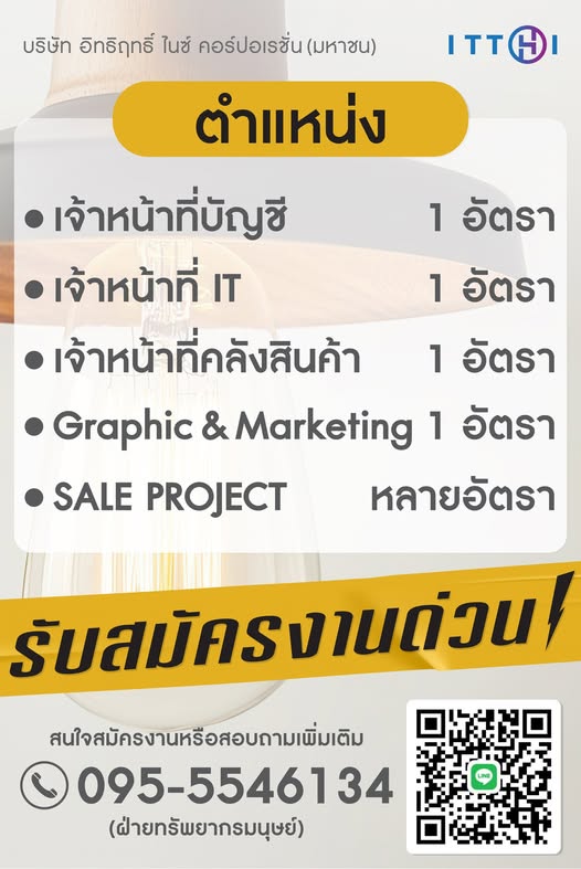 บริษัท อิทธิฤทธิ์ ไนซ์ คอร์ปอเรชั่น จำกัด (มหาชน) เปิดรับสมัครงาน หลายตำแหน่ง หลายอัตรา October 6, 2025 Natamon Ngamsanga ข่าวสมัครงาน รับสมัครด่วน!!!! บริษัท อิทธิฤทธิ์ ไนซ์ คอร์ปอเรชั่น จำกัด (มหาชน) เปิดรับสมัครงาน หลายตำแหน่ง หลายอัตรา สนใจตำแหน่งไหน INBOX สมัครงานไว้ได้เลย ติดต่อฝ่าย HR โทร. 0955546134 Line : qmrhr E-mail : hrm.recruit@lighttrio.com