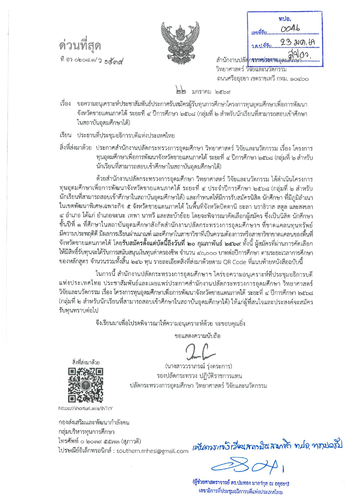 มหาวิทยาลัยสวนดุสิต ขอประชาสัมพันธ์โครงการ ทุนอุดมศึกษาเพื่อการพัฒนาจังหวัดชายแดนภาคใต้ ระยะที่ ๔ ประจำปีการศึกษา ๒๕๖๘ (กลุ่มที่ ๒ สำหรับนักเรียนที่สามารถสอบเข้าศึกษาในสถาบันอุดมศึกษาได้) ตามที่สำนักงานปลัดกระทรวงการอุดมศึกษา วิทยาศาสตร์ วิจัยและนวัตกรรม ได้มีหนังสือขอความอนุเคราะห์ให้สถาบันอุดมศึกษาร่วมประชาสัมพันธ์การรับสมัครผู้ขอรับทุนการศึกษาดังกล่าว