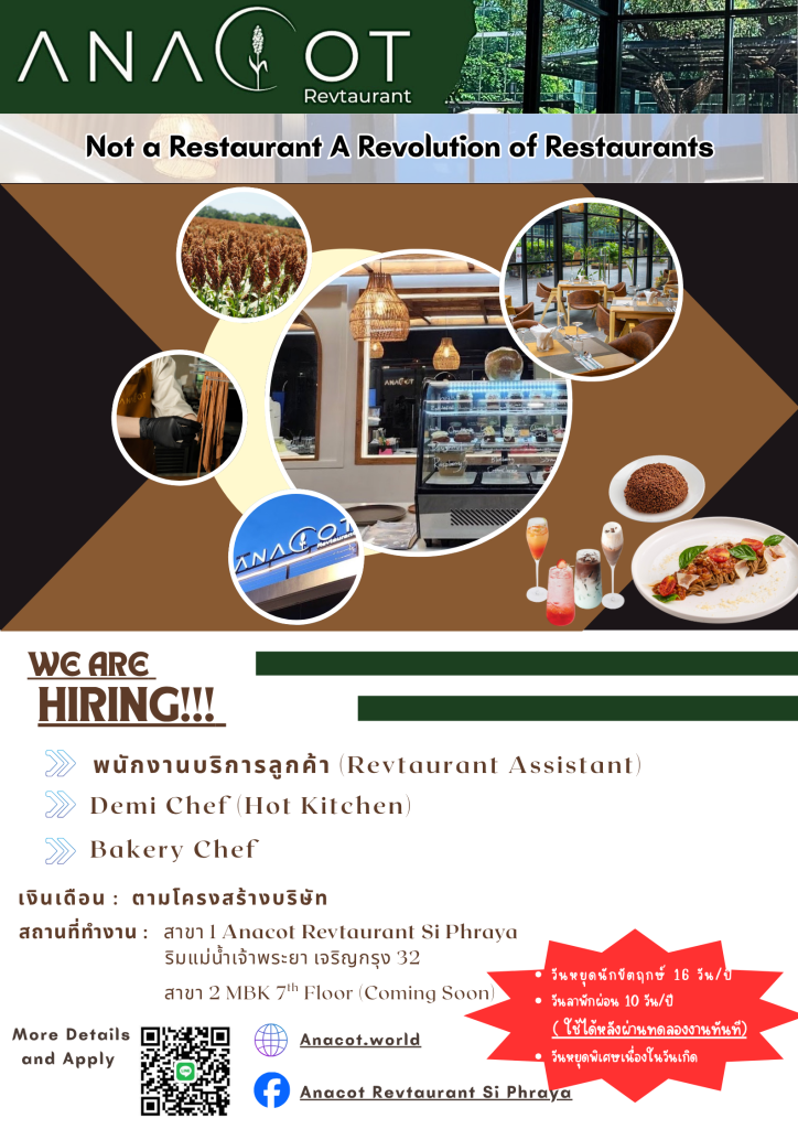 บริษัทเอ็นเซิฟ ไลฟ์ แอนด์ เฮลท์ จำกัด รับสมัครงานหลายตำแหน่ง March 24, 2026 Natamon Ngamsanga ข่าวสมัครงาน บริษัทเอ็นเซิฟ ไลฟ์ แอนด์ เฮลท์ จำกัด ทำธุรกิจประกอบกิจการร้านอาหาร ในชื่อร้าน “ANACOT REVTAURANT” มีความประสงค์จะประชาสัมพันธ์ให้น้องๆนักศึกษาจากสถาบันของท่านมาร่วมทำงานกับบริษัทของเรา